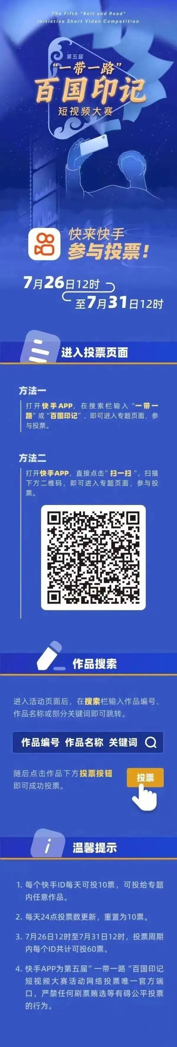 7月26日,由外交部新聞司、中央網信辦網絡傳播局指導,中國公共外交協會、國務院國資委新聞中心、環球網聯合主辦的第五屆“一帶一路”百國印記短視頻大賽完成作品征集,正式開啟投票階段。