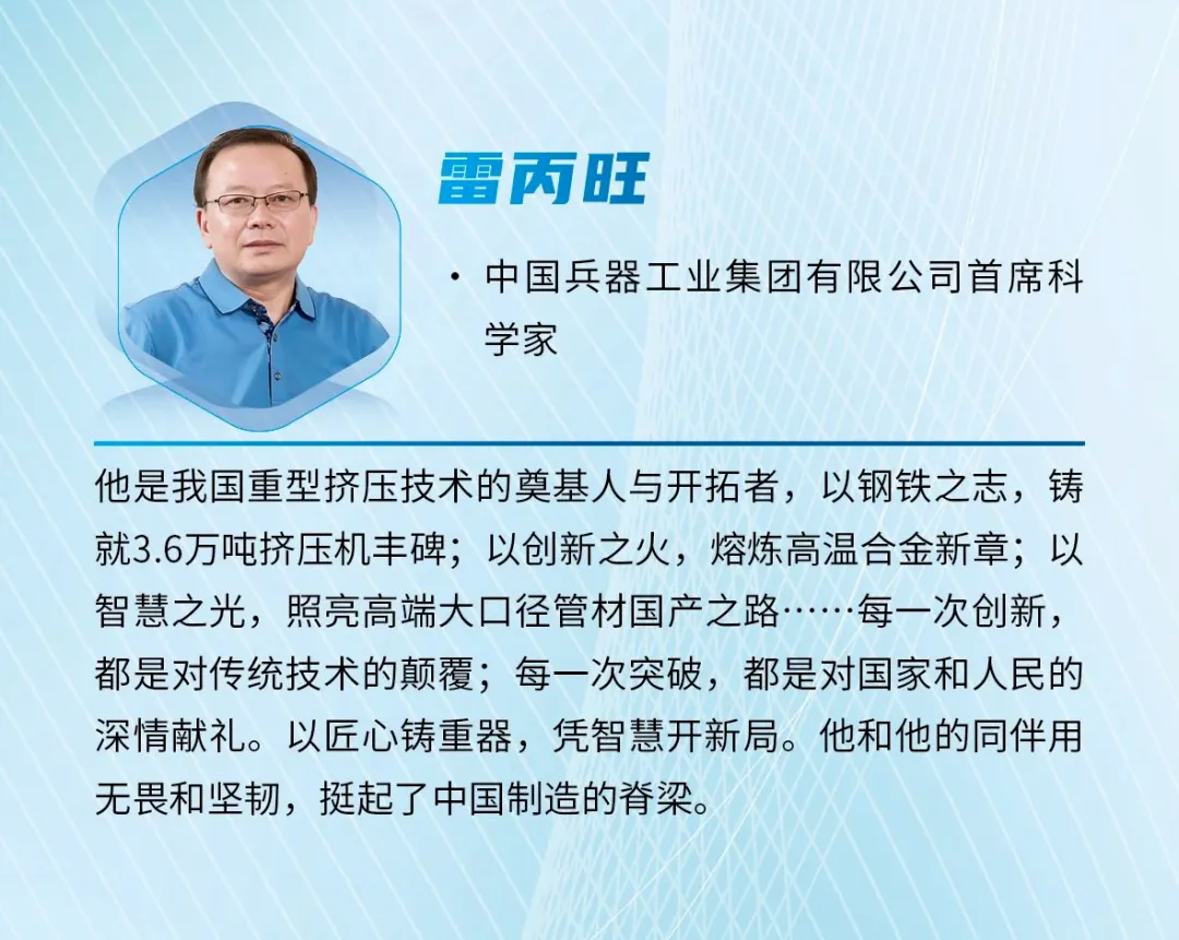 近日,《科學(xué)中國人》雜志社發(fā)布2024“年度科技人物”榜單,中國兵器首席科學(xué)家、北重集團(tuán)雷丙旺當(dāng)選“影響力科學(xué)家”。 雷丙旺是我國極端金屬擠壓技術(shù)的開拓者,扎根邊疆地區(qū)國防特大型企業(yè)工作38年,長期從事金屬成形制造裝備與工藝研究工作。他研制出我國極限制造的大國重器——3.6萬噸黑色金屬垂直擠壓機(jī),一舉打破國外技術(shù)封鎖,填補(bǔ)國內(nèi)空白,實(shí)現(xiàn)了超(超)臨界電站核心管道和航空發(fā)動(dòng)機(jī)高壓渦輪盤粉末合金棒材的中國制造,開發(fā)出成套關(guān)鍵技術(shù),取得一系列原創(chuàng)性成果,促進(jìn)了產(chǎn)業(yè)的融合發(fā)展,創(chuàng)造巨大經(jīng)濟(jì)社會(huì)效益。